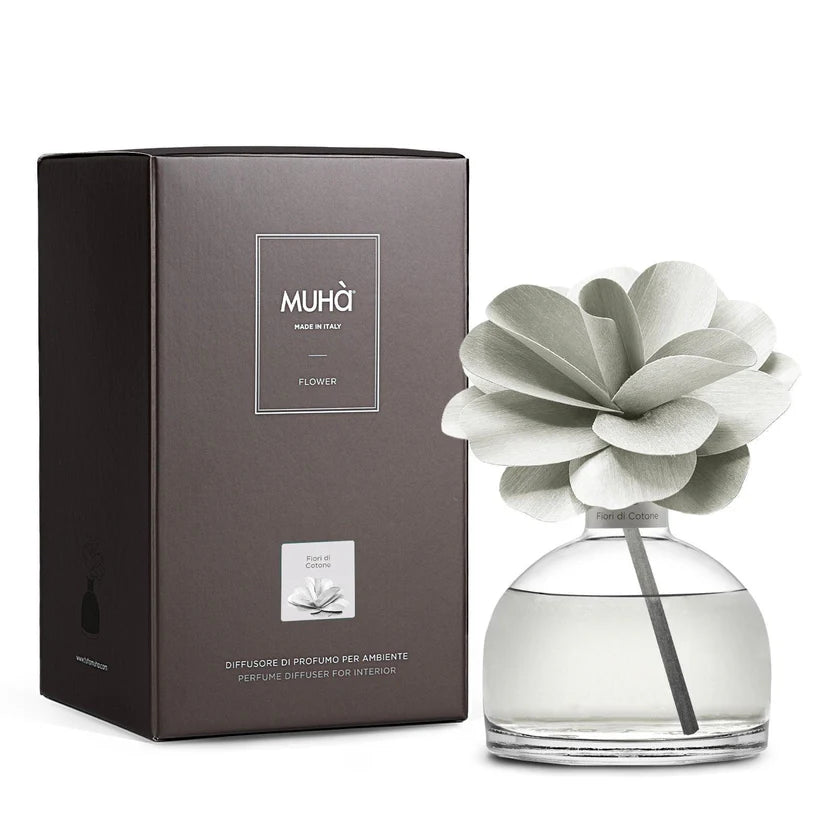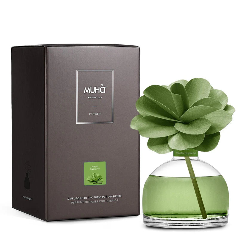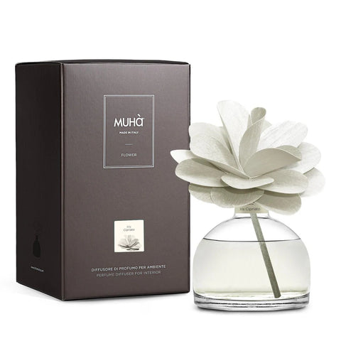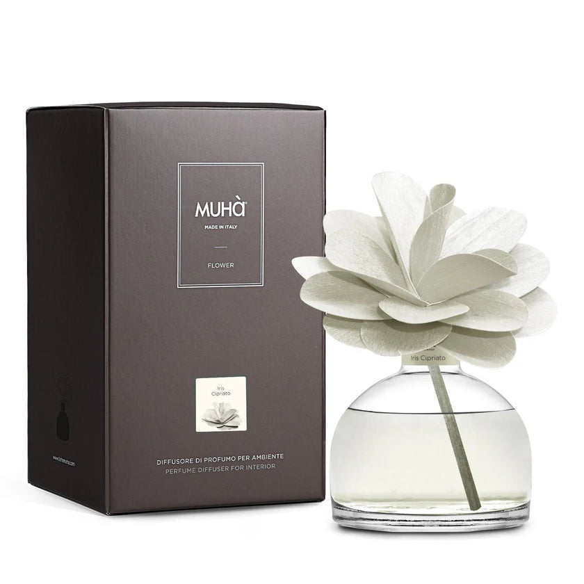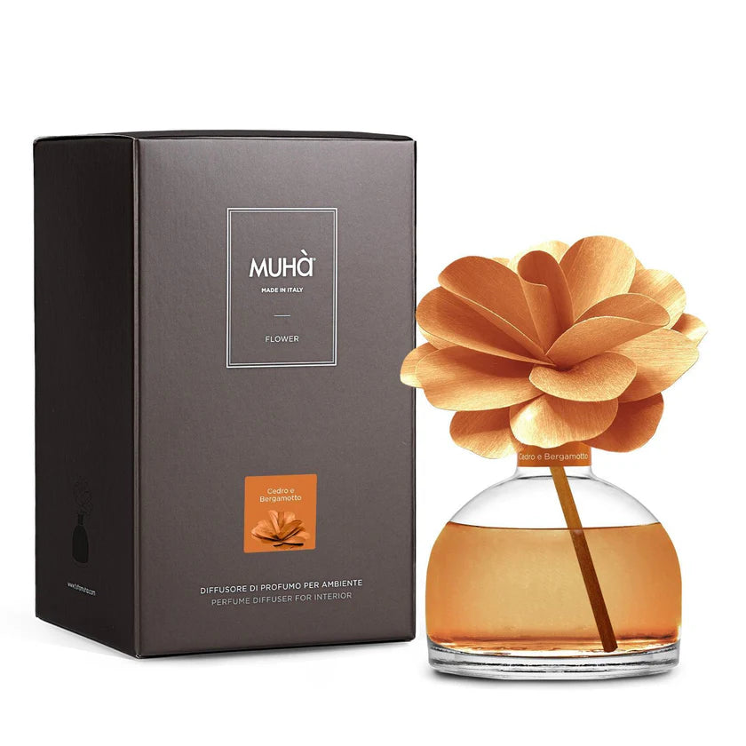 Una raffinata confezione in bottiglia di vetro, con diffusore a forma di rosa in legno di betulla naturale realizzato a mano. Completo di essenza 200 ml.