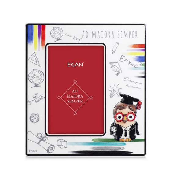 Un portafoto in ceramica smaltata con gufetto laureato. Simpatica idea regalo o bomboniera per laurea.