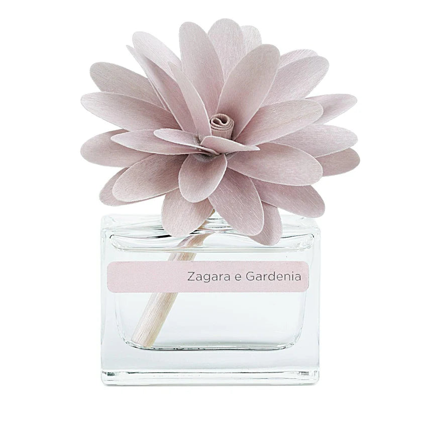 Bomboniere profuma ambiente in una raffinata confezione in bottiglia di vetro con diffusore a forma di fiore in legno di betulla naturale realizzato a mano.